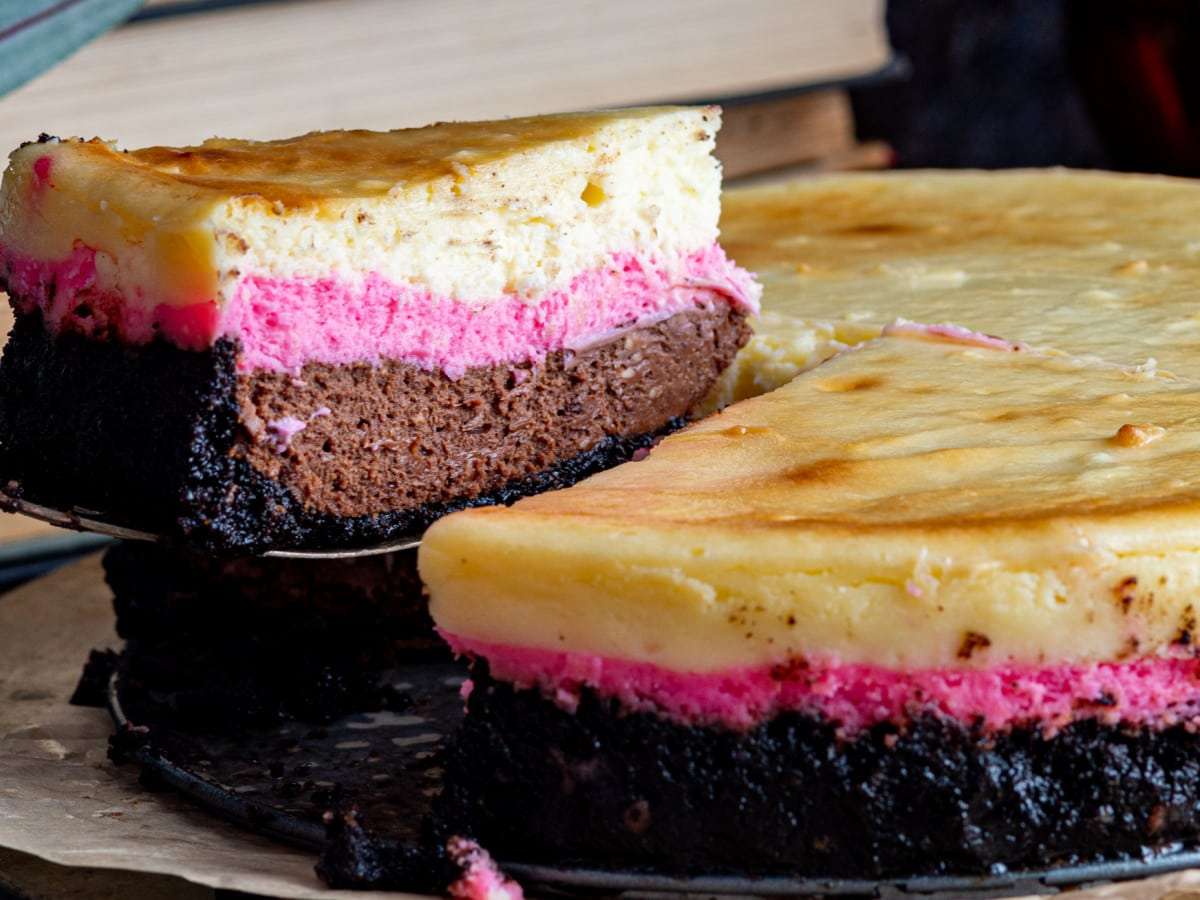 Neapolitan cheesecake is loaded with three cheesecake flavors. This triple layer cheesecake looks fancy, but it's actually quite easy to make.