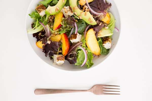 - Divide the greens into 4 large bowls. Place the nectarines, avocado, wheat berries, sliced onion, and tofu on top of the greens.