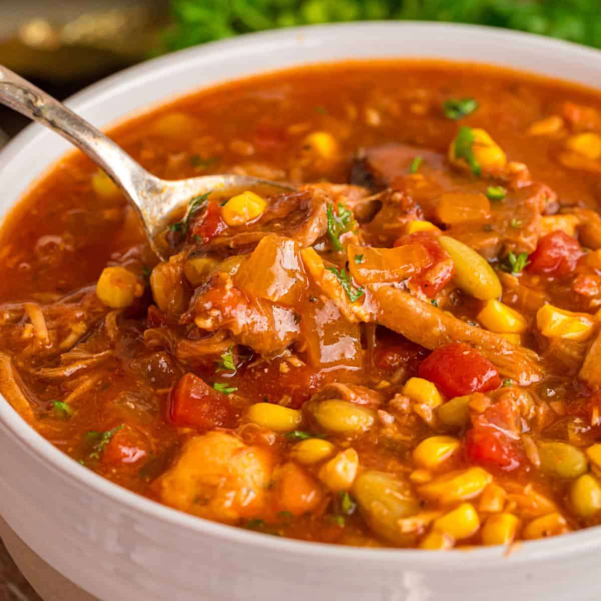 This Brunswick Stew recipe is made with pulled pork, shredded beef, and pulled chicken in a broth flavored with BBQ sauce. Hearty, filling, and easy to make, this stew is one you'll want to make over and over again during the winter!