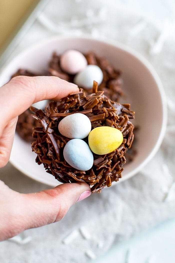 - Let toasted coconut cool on baking sheet while melting chocolate. Add chocolate chips to a microwave-safe bowl and melt in 20-30 second increments until the chocolate is melted. Add cooled coconut and melted chocolate into a large bowl and toss to combine. Use a spoon or ice cream scoop to scoop about 2-3 Tablespoons of the coconut chocolate mixture onto a piece of parchment and shape into a nest. Top each nest with 2-3 eggs. Repeat with remaining ingredients.