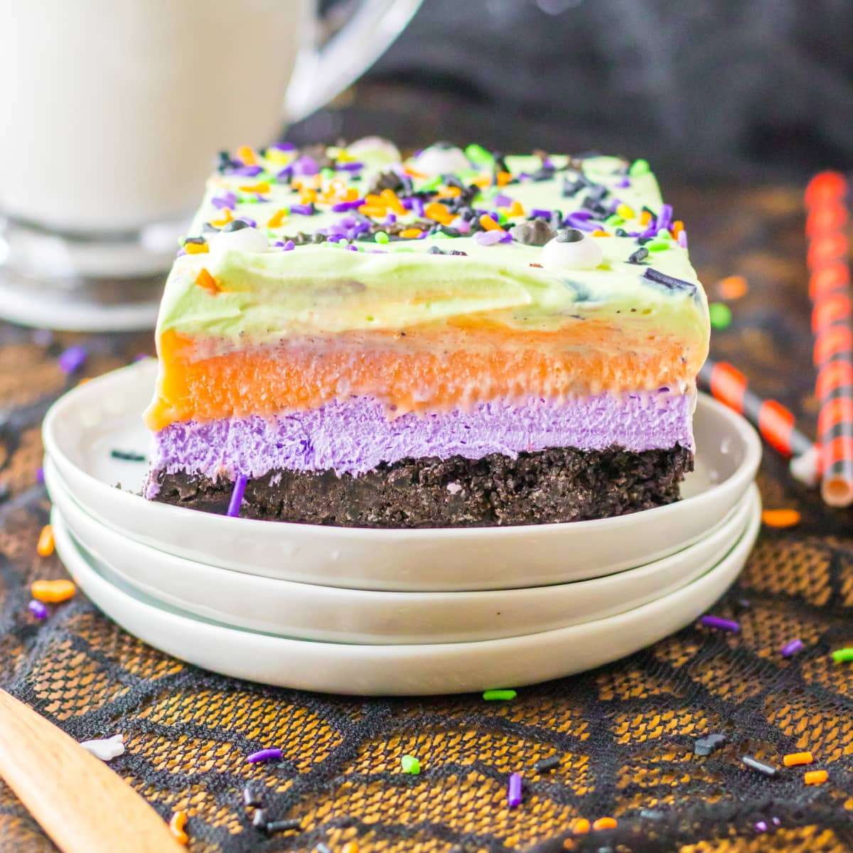 Halloween is just around the corner, and what better way to celebrate than with this easy Halloween Dessert. Colorful layers of pudding and cheesecake on top of a Oreo crust, this no-bake lush is sure to impress with very little effort!