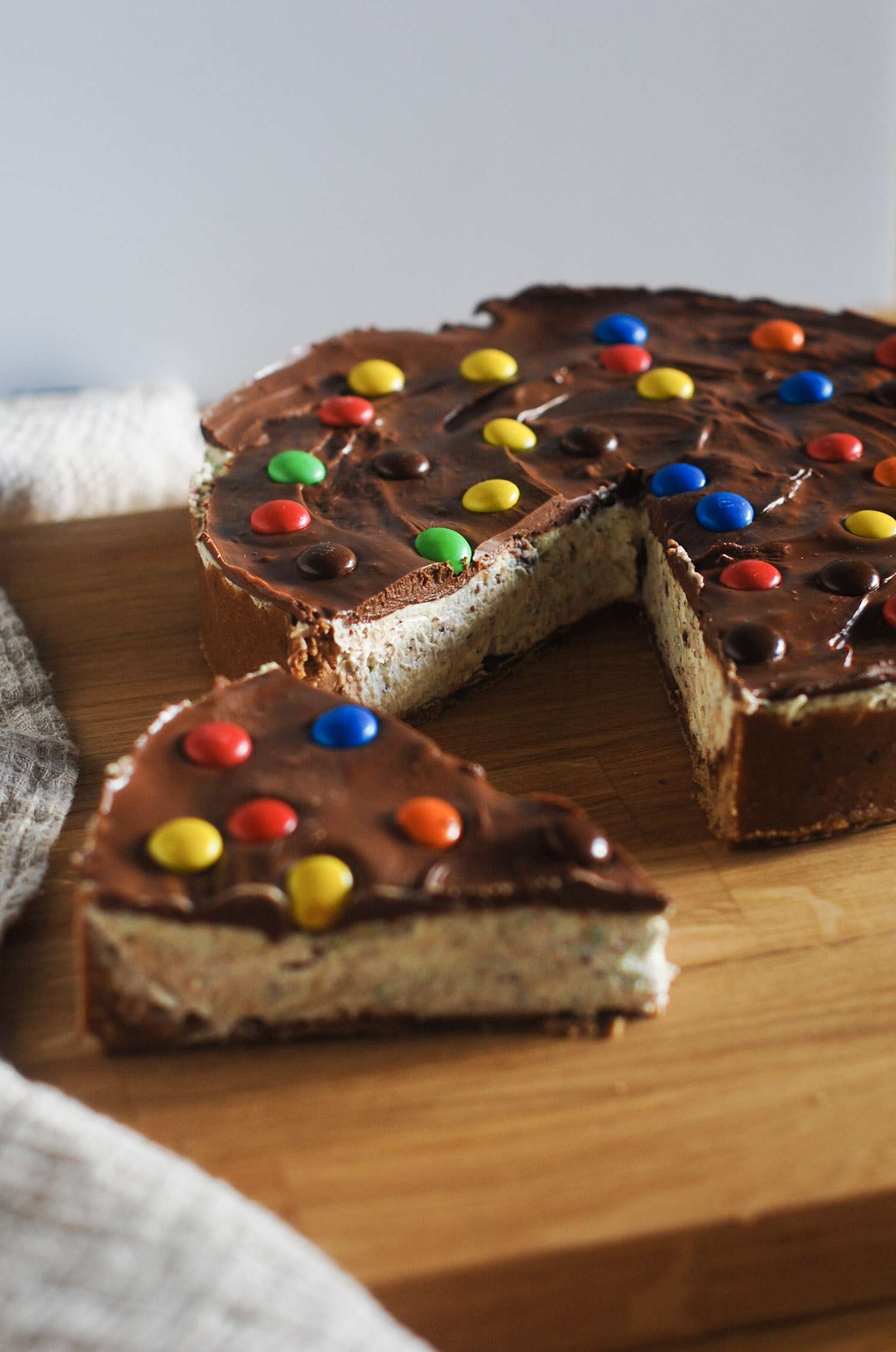 A no-bake cheesecake full of crunchy, chocolate M&Ms, topped with melted Nutella plus more M&MS! Indulgent to say the least.