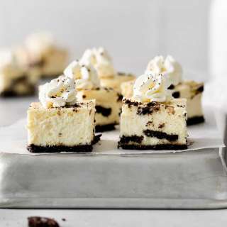 - In the same ziploc bag, crush remaining 12 OREO cookies into fine crumbs. Sprinkle evenly over the tops of the two cheesecakes. Using the remaining 4 oz of COOL WHIP, pipe small dollops around the edges to give it a finished look. Add mini OREO cookies if desired.