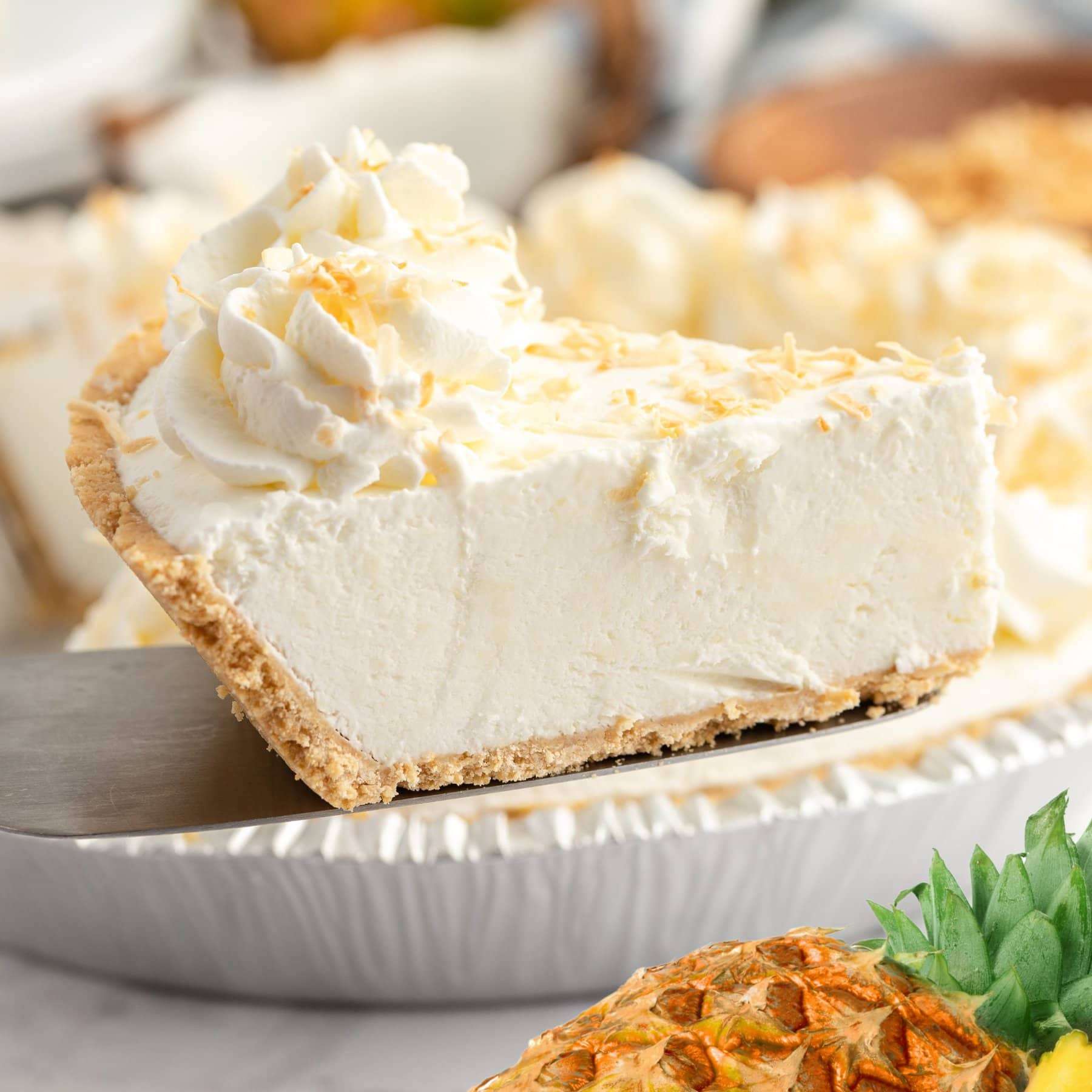 This No Bake Pina Colada Pie is the perfect summertime dessert! A graham cracker crust filled with a coconut and pineapple filling topped with shredded coconut. It's the perfect balance of sweet and tart.
