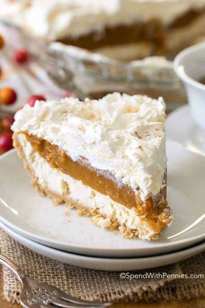 A simple no bake pie with layers of cheesecake, pumpkin and whipped topping. This No Bake Pumpkin Cheesecake is definitely going to be your new favorite fall dessert!