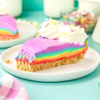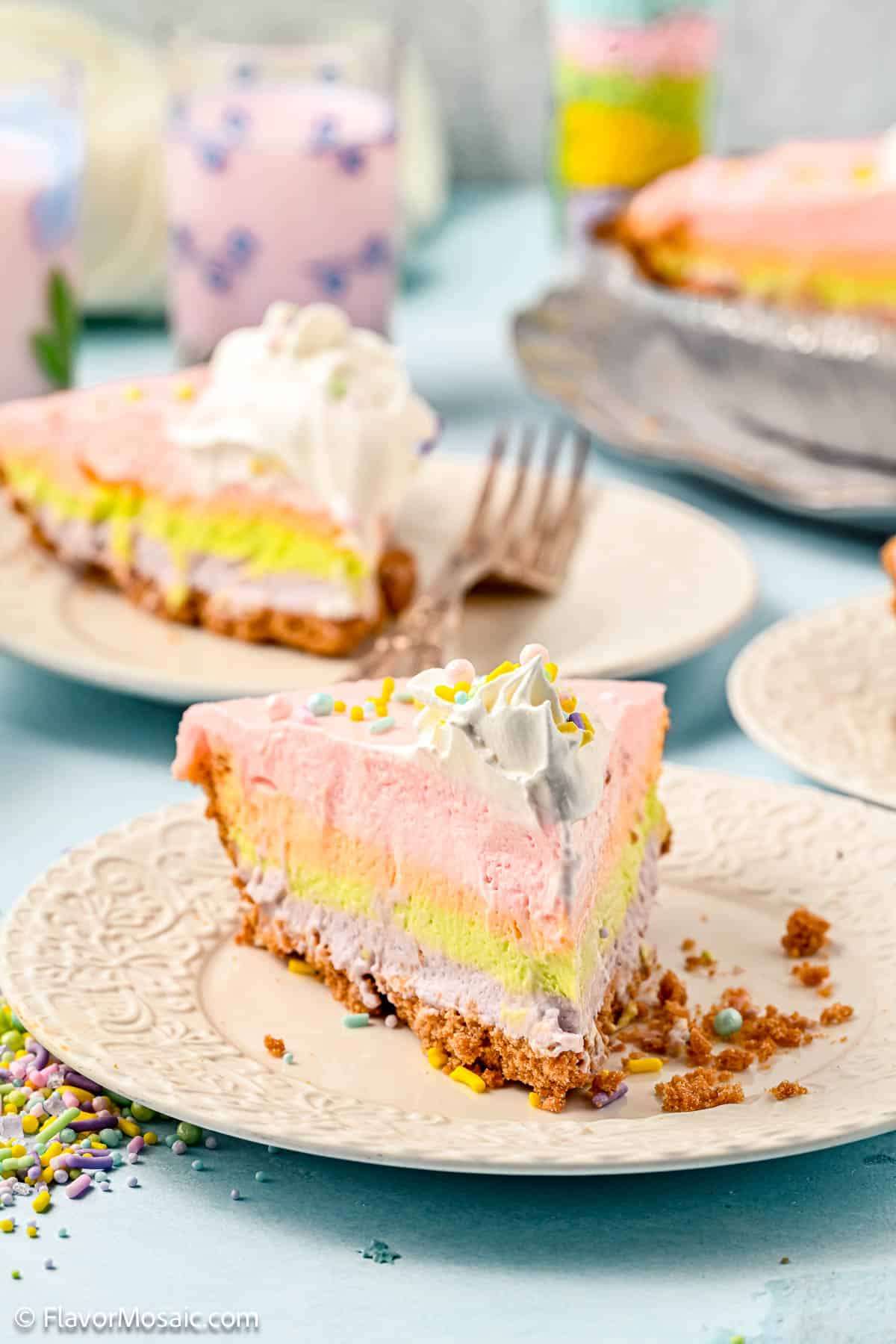 This No Bake rainbow cheesecake pie is easy to make. Fluffy cheesecake filling is colored into pastel rainbow colors. This is such a pretty spring or Easter dessert.