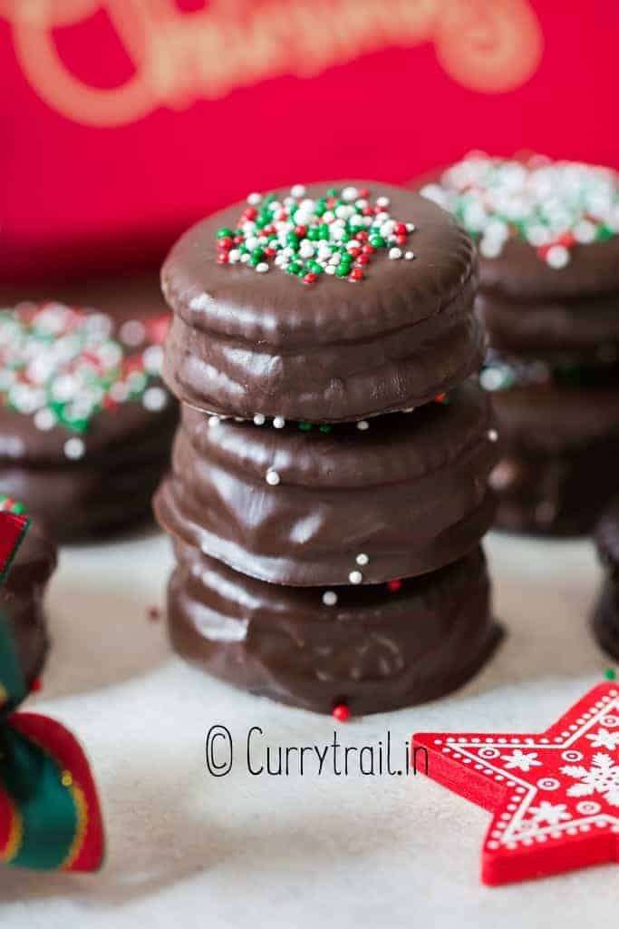 - Use two forks to flip cracker sandwich in melted chocolate. It’s easy to tap off excess chocolate coating with fork.