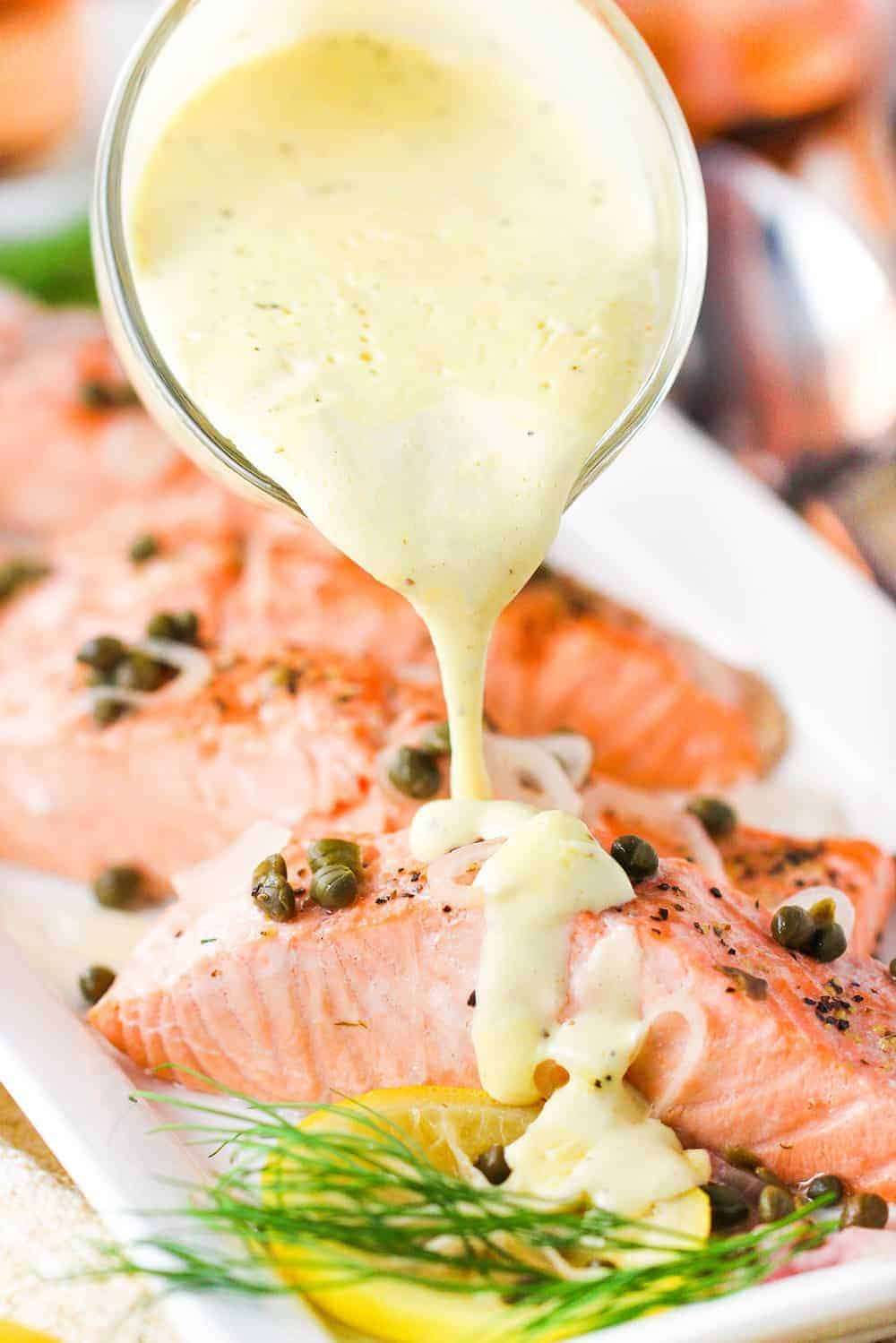 - Slowly pour in the warm melted butter. Blend until sauce is thick and smooth.
