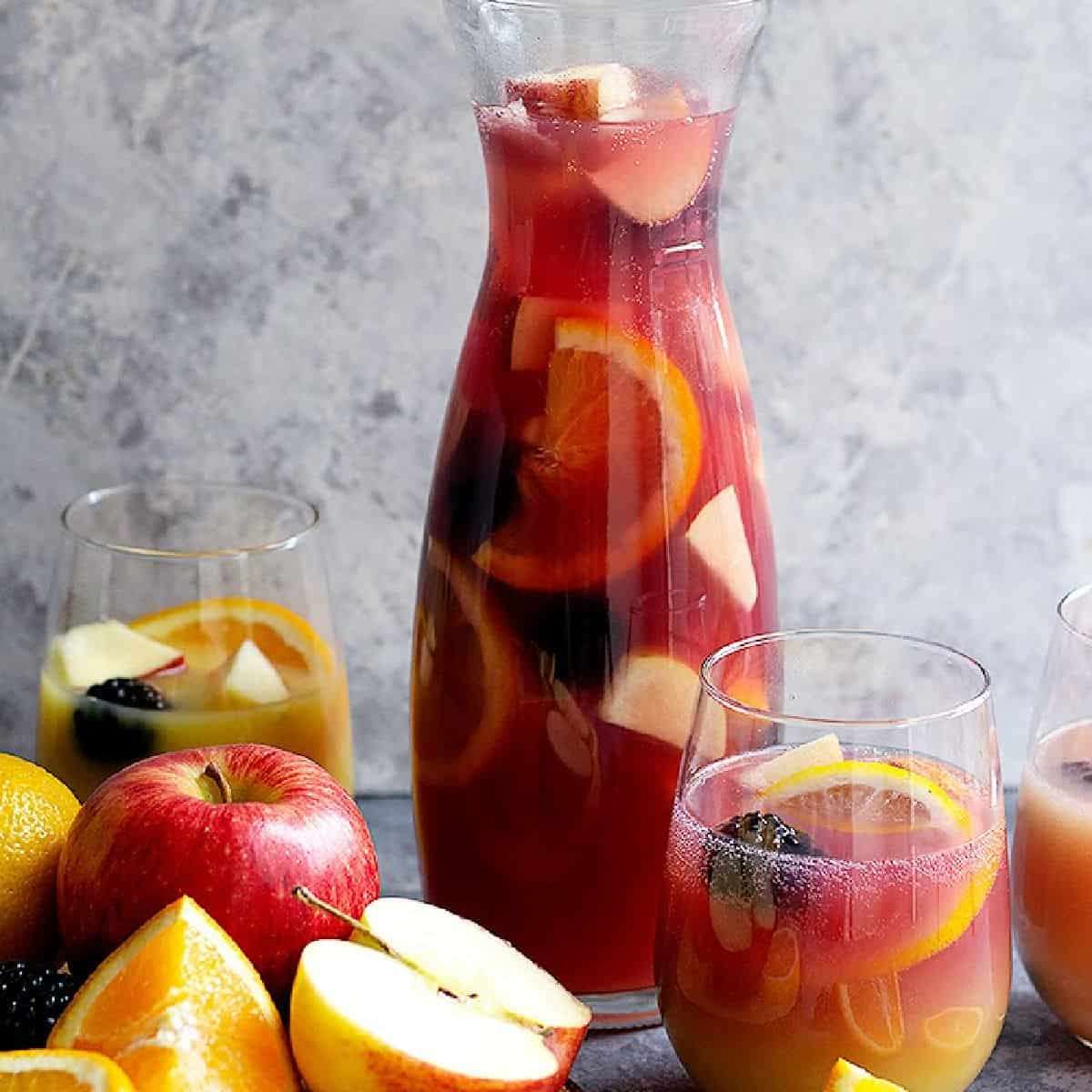 - Place the apple pieces, orange and lemon slices and blackberries into a glass pitcher.