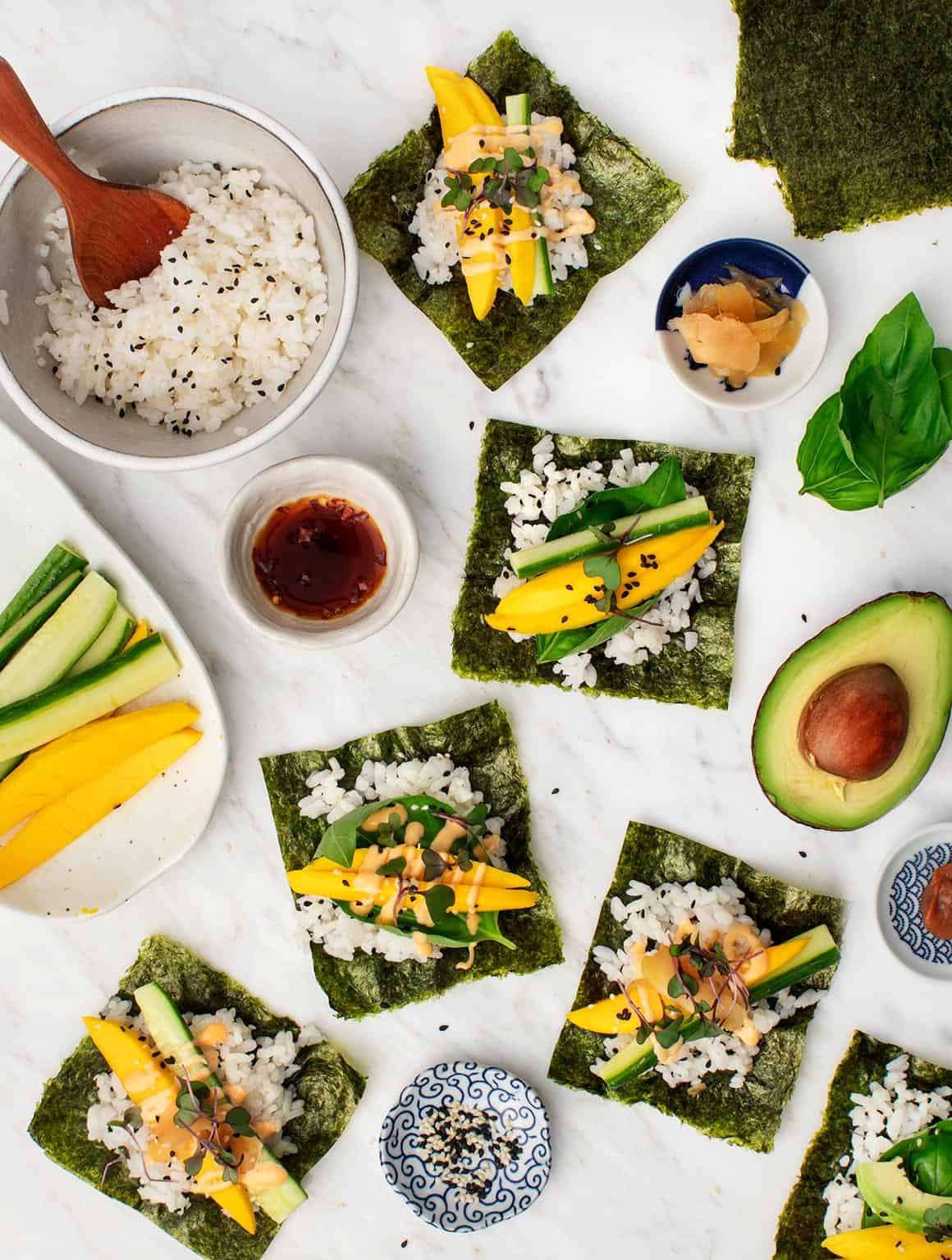 - Serve the nori squares, rice, cucumber, mango, avocado, pickled ginger, sesame seeds, and desired extras, on a platter to assemble as you eat, mixing and matching fillings as you like. Serve with the tamari-lime dipping sauce and spicy mayo.