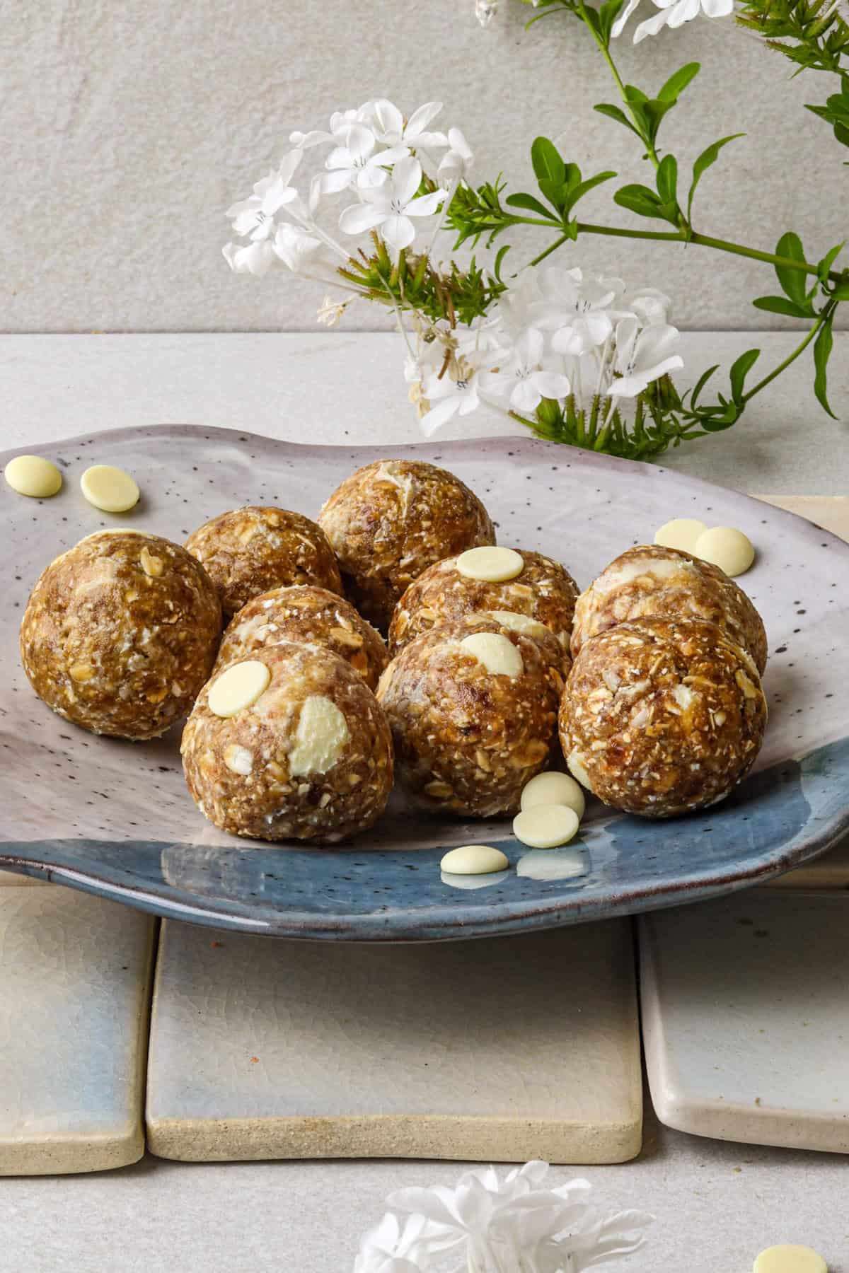 - Add all the ingredients except the white chocolate chips into the bowl of your food processor. Blend everything until it forms a ball.