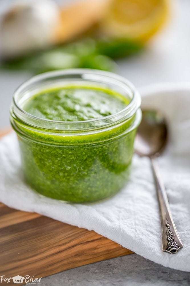 This easy Homemade Pesto is also nut free! It only takes 5 minutes and tastes amazing. Freshly made pesto is like summer in a jar!