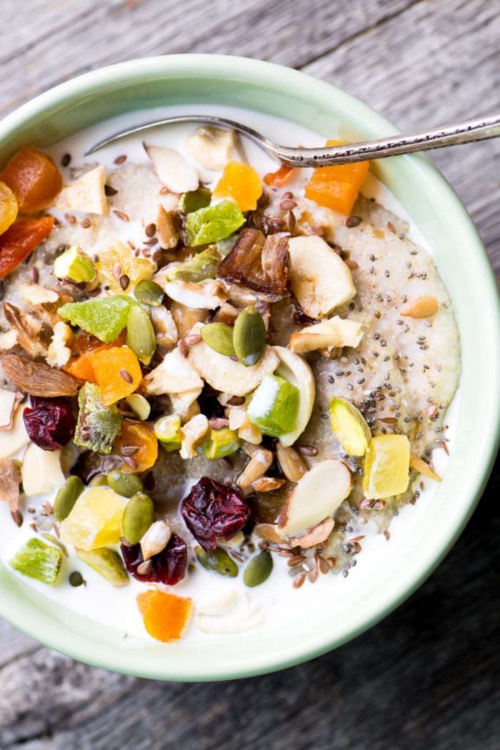 - Spoon the oat bran into 2 bowls, and add a sprinkle of dark brown sugar and some of the fruit/nut/seed mix. Top with a little milk, half and half, or coconut milk, and enjoy!