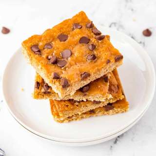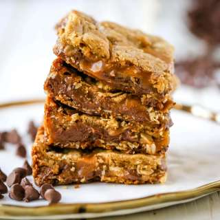 - When the bars have been removed from the oven, sprinkle the chocolate chips over the crust and pour the melted caramel over the top. Sprinkle the rest of the crust over the top and bake in the oven for an additional 10-12 minutes, until the caramel is bubbling and edges are lightly browned.