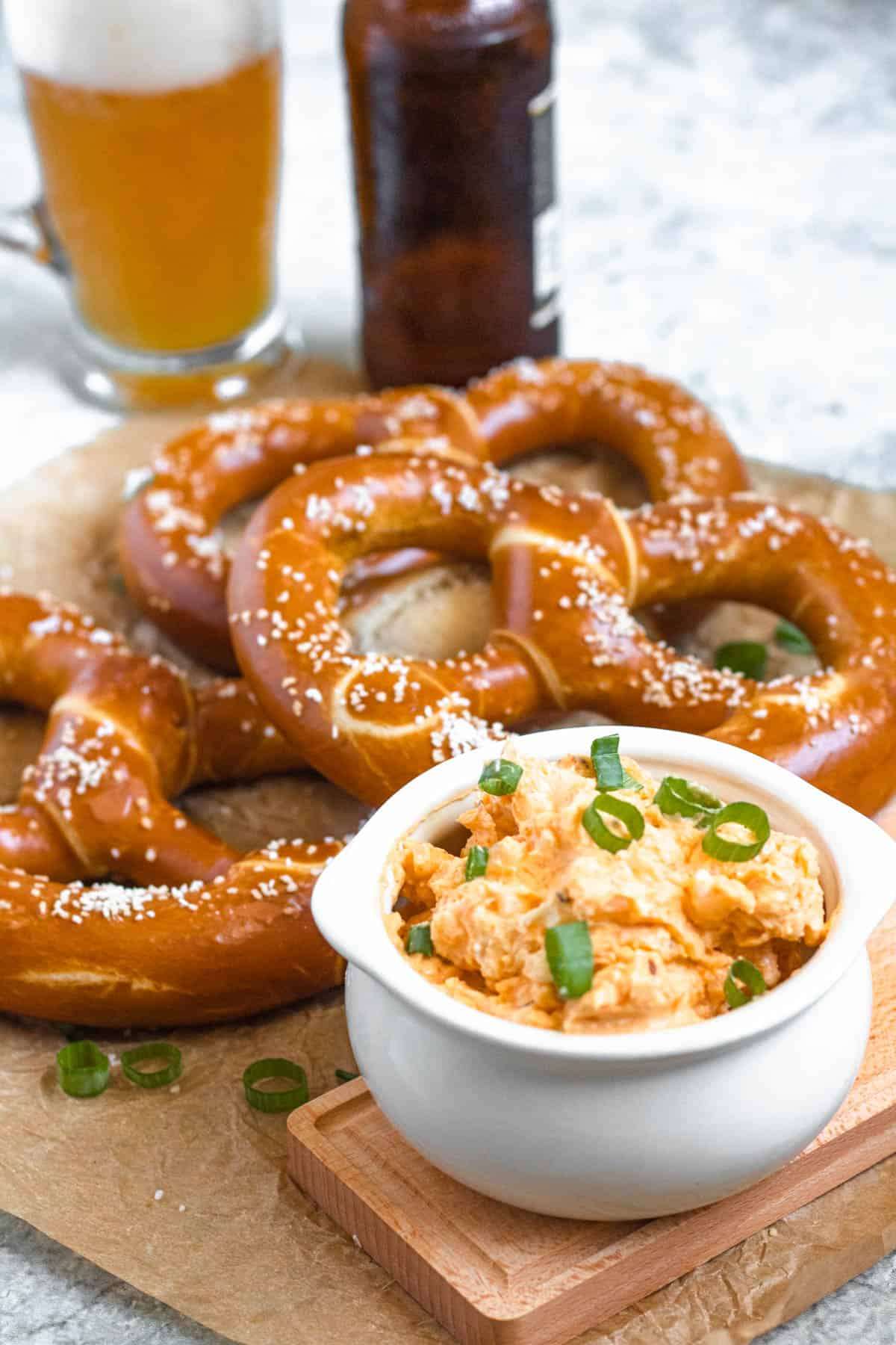 Obatzda is a German Beer Cheese Spread that is served with soft pretzels. This recipe is made with brie cheese, cream cheese, onions, and spices.