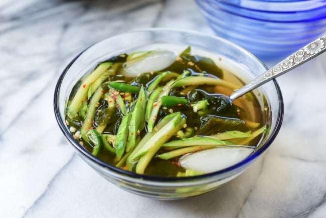 Oi naengguk is a classic chilled soup made with cucumber and seaweed (miyeok). It’s a refreshing, tangy soup that’s perfect for hot summer days!