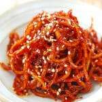 - Cut the dried squid strings into shorter lengths with kitchen scissors. Rinse in cold water, and drain. Add 1/2 cup of water, and cover. Set it aside until softened, about 20 minutes, flipping over once.