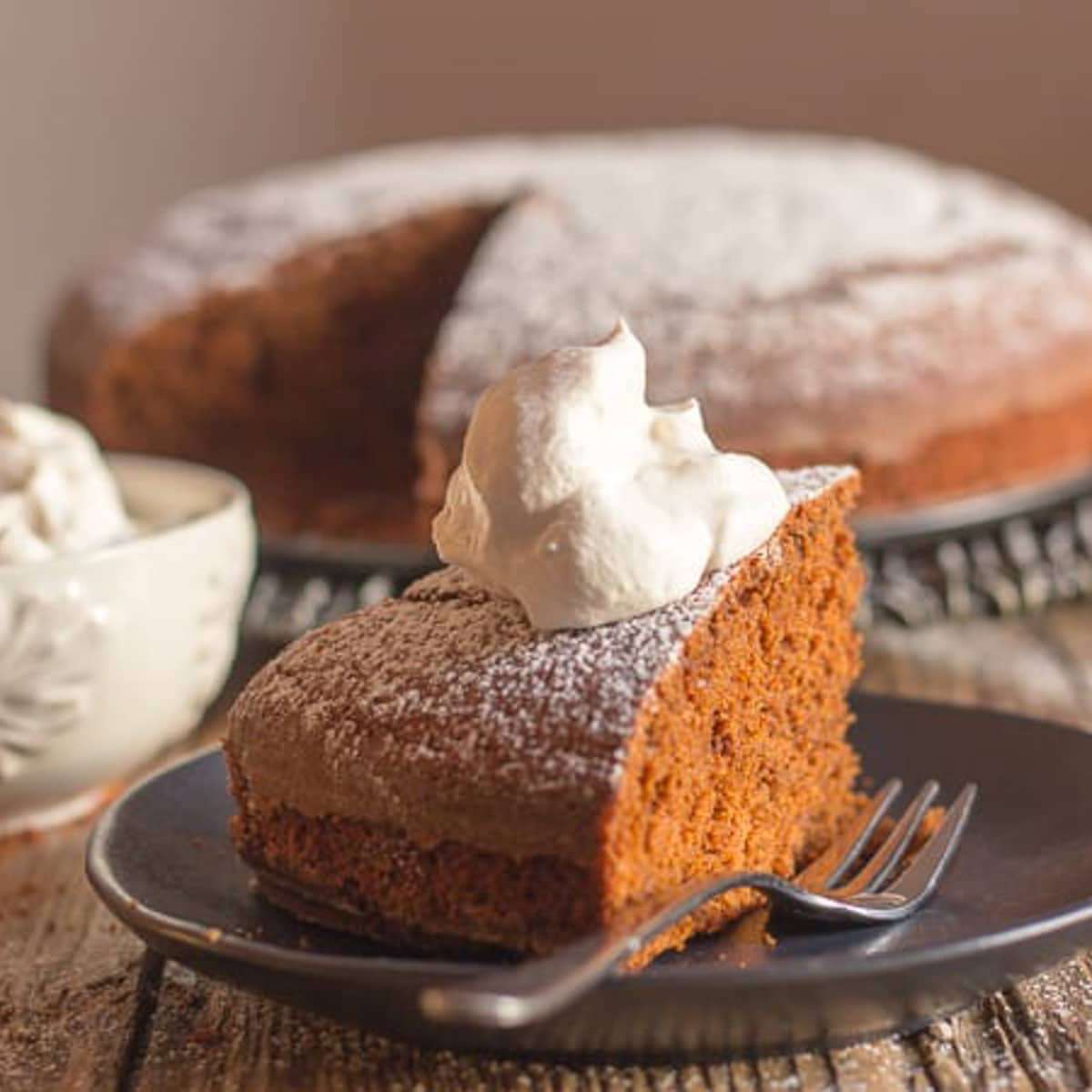 - Pour into prepared cake pan and bake for approximately 30-40 minutes or until toothpick comes out clean. Let cool completely before serving. Serve with a spoonful of Cinnamon whipped cream. Enjoy!