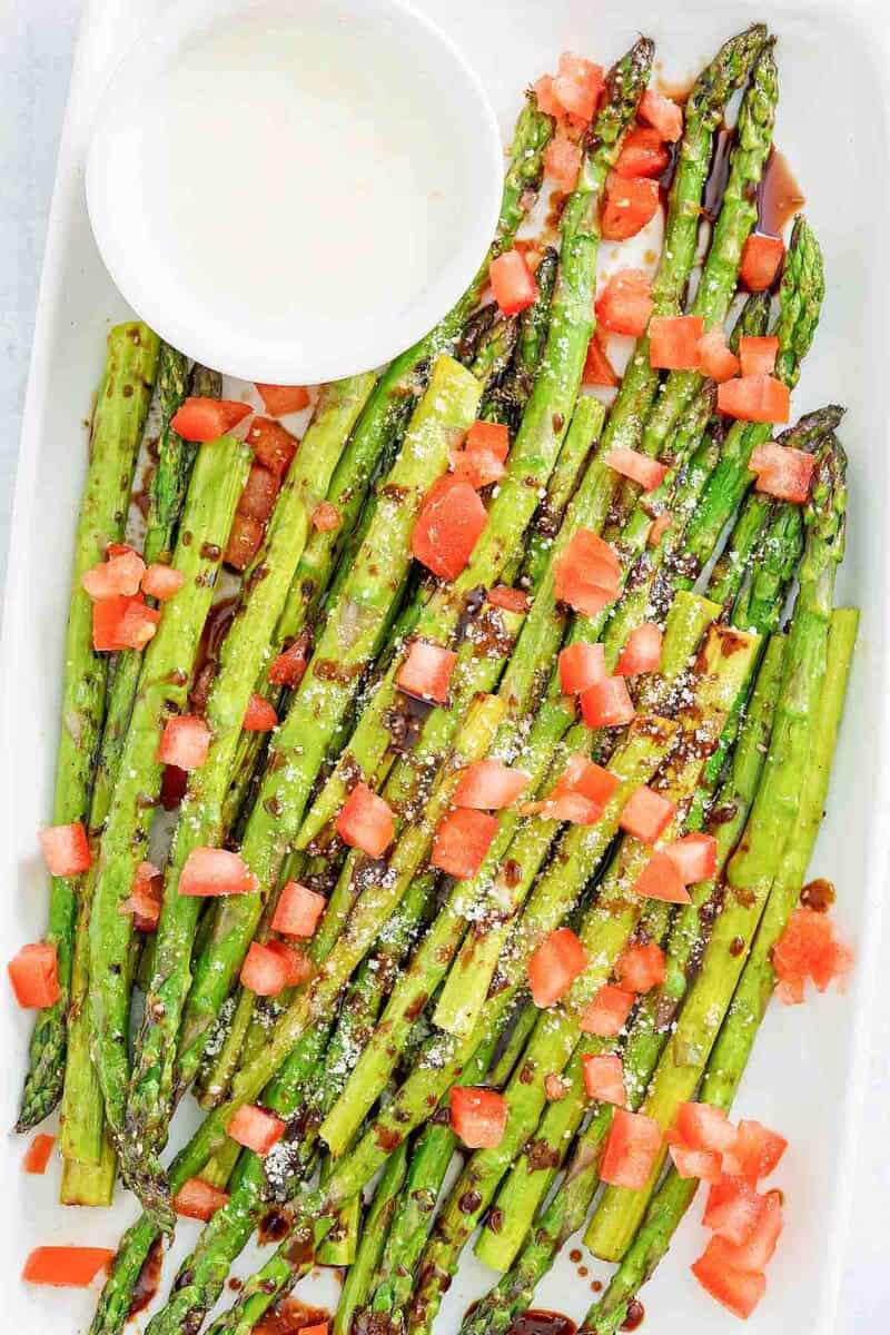 - To serve, place some of the cooked asparaguses on a plate, drizzle balsamic vinegar on top. Garnish with 1 tablespoon Parmesan cheese, and then serve with the sauce. Garnish with fresh chopped tomatoes if desired.