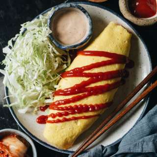 - Flip it onto a plate. If desired, you can shape the omurice by hand using aluminium foil or a paper towel. Drizzle some ketchup on top. Repeat the last 3 steps for another serving.