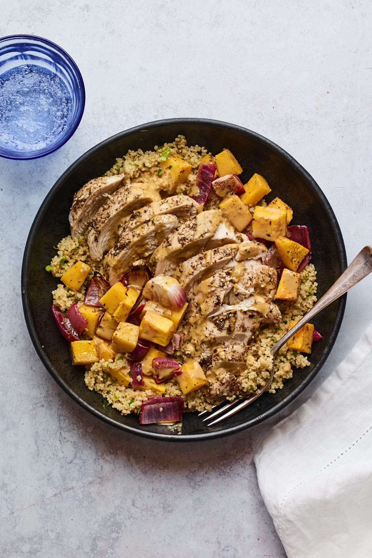 - Serve immediately. Drizzle chicken and veggies with tahini dressing, if using.