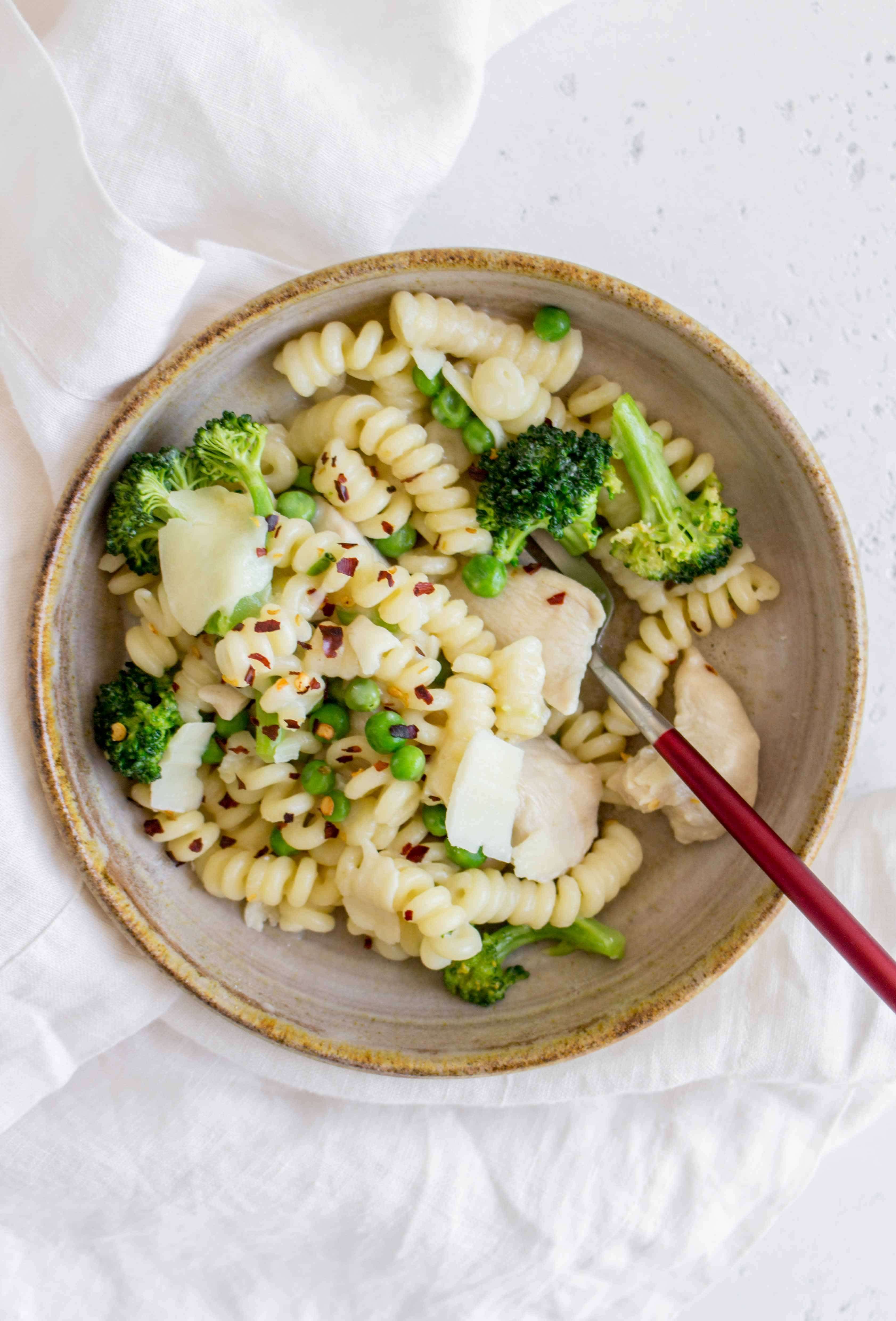 One Pot Chicken, Broccoli, and Peas Pasta