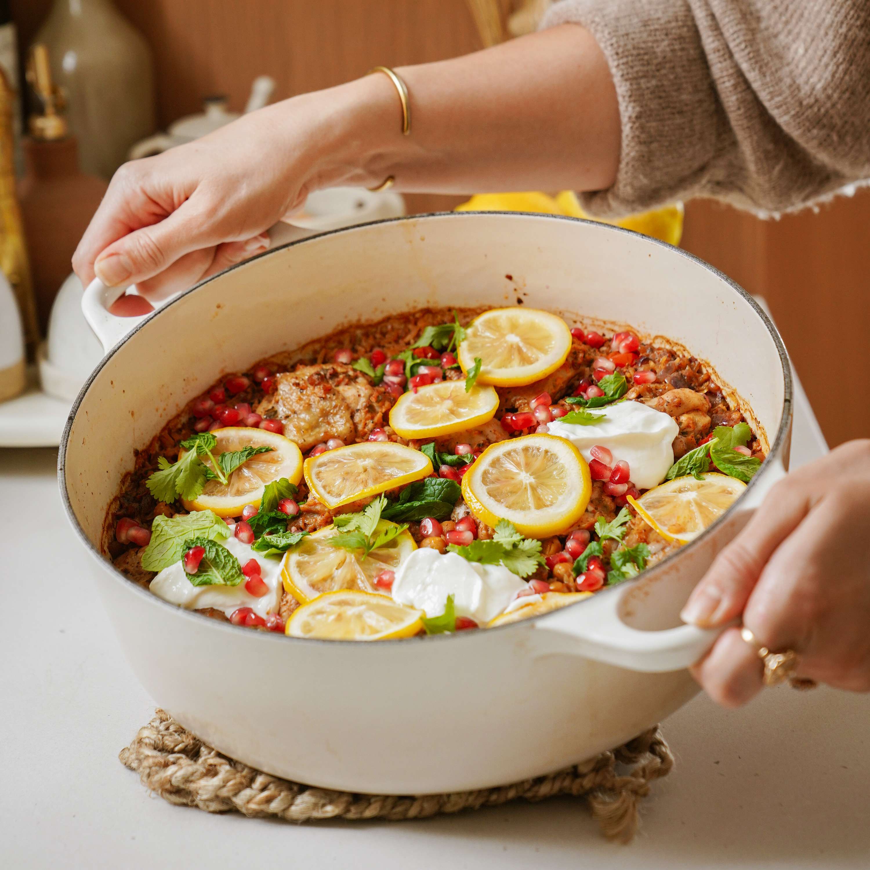 - Serve topped with fresh lemon slices, Greek yogurt, pomegranate seeds, fresh cilantro and fresh mint.