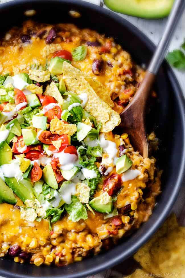 - Once rice is done, stir in refried beans until smooth followed by 3/4 cup cheese until smooth. Top with remaining cheese, cover and cook on low until cheese is melted. Top with lettuce, tomatoes, avocados etc. and either sour cream or the Jalapeno Ranch. Serve with plenty of chips!