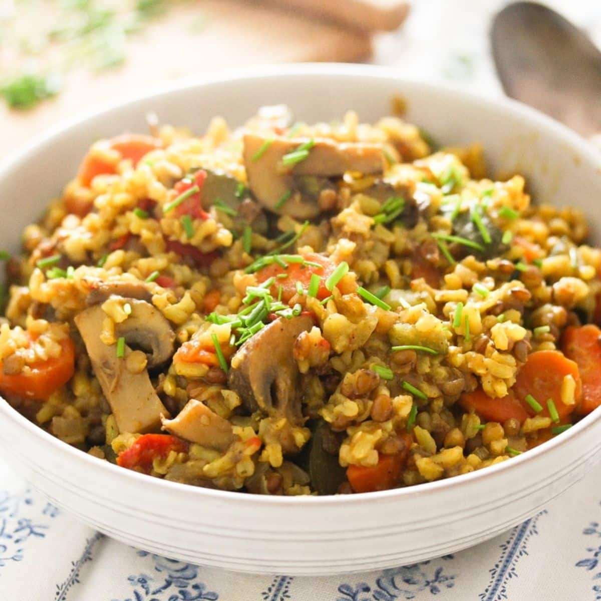 This simple and delicious one-pot vegan pilaf is made with brown rice, lentils, mushrooms, and lots of spices. It is perfect for a hearty and flavorful meal.