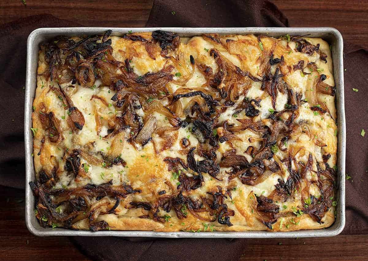 Onion Focaccia Bread is focaccia bread that is topped and baked with caramelized onions and white cheddar cheese for a delicious appetizer.