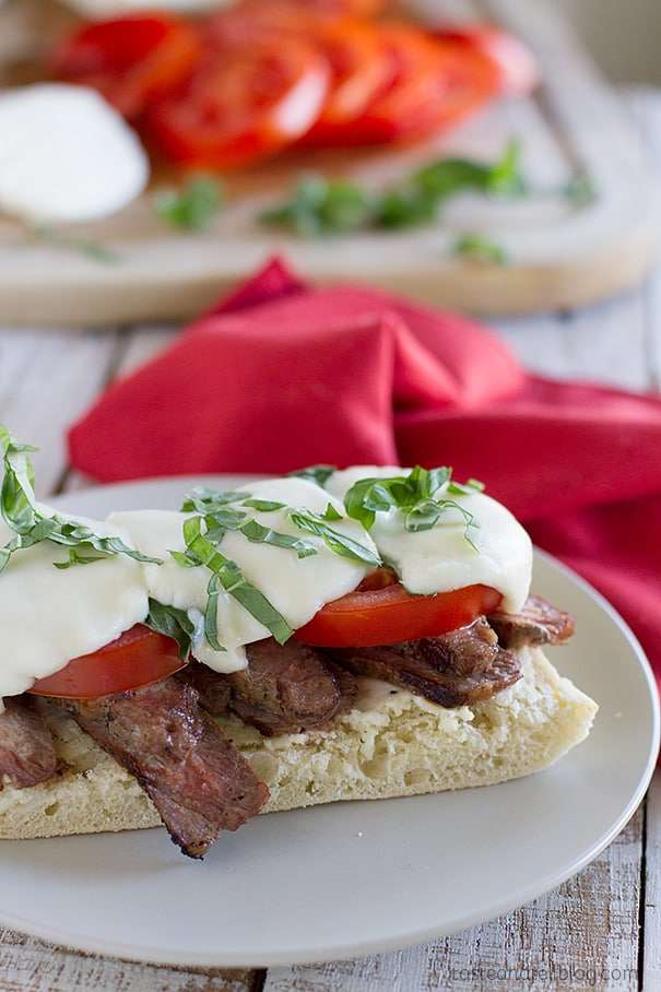 - Spread the garlic and herb cheese on the cut sides of the bread. Layer the steak on top, followed by the tomatoes. Sprinkle with basil, then layer the cheese on top. Return the sandwiches to the oven to let the cheese melt, another 5-10 minutes. Serve warm.