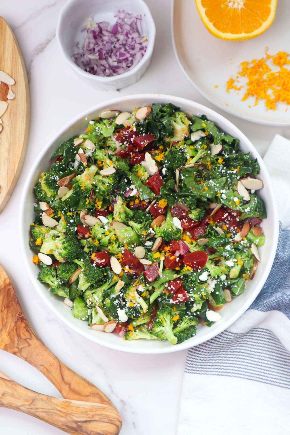 - Add beets, red onion, kale, and broccoli to a large mixing bowl. Stir in the orange ginger dressing until well combined.