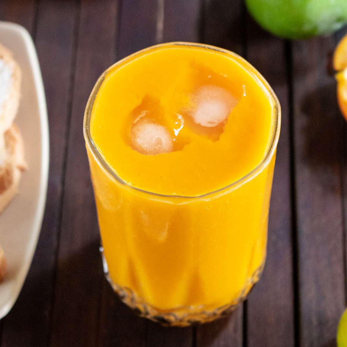 - Place mango pieces and orange juice with ice water or ice cubes into a blender jar. Briefly blend to a smooth consistency.