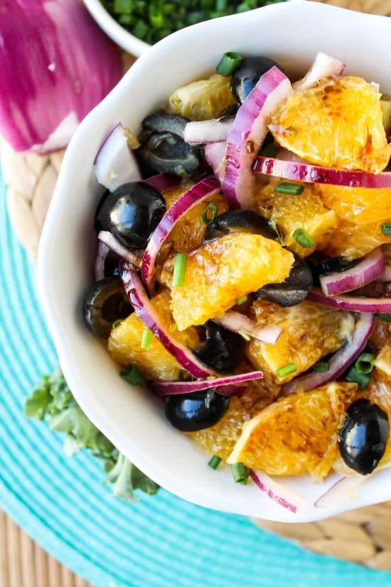 Orange Olive Salad with Balsamic Vinaigrette combines fresh oranges with briny olive and bright red onions to create a delicious and unexpected side dish. The balsamic vinaigrette marries all the flavors nicely. It goes perfectly with whatever meat you have coming off the grill!