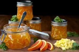 - Prepare glass jars or plastic containers and lids by washing them in hot soapy water or in a dishwasher. I like to use ½ pint and ¼ pint size jars, but feel free to use any size. The recipe will make 5 cups of marmalade.
