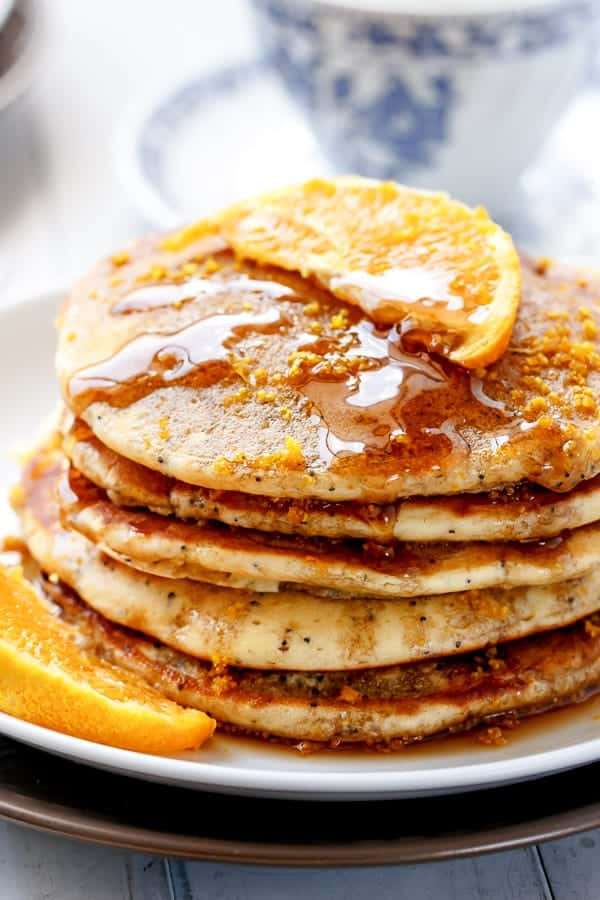 The perfect lazy Sunday morning breakfast. Fluffy pancakes flavoured with natural orange juice and zest to give the best flavour with poppy seeds, drizzled with an orange infused maple syrup. So simple, yet so satisfying!
