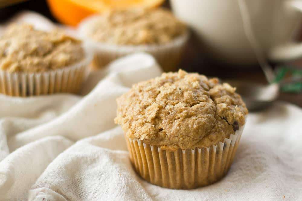 These vegan orange spice muffins are made with a base of oat flour and almond butter, and studded with dark chocolate chips.
