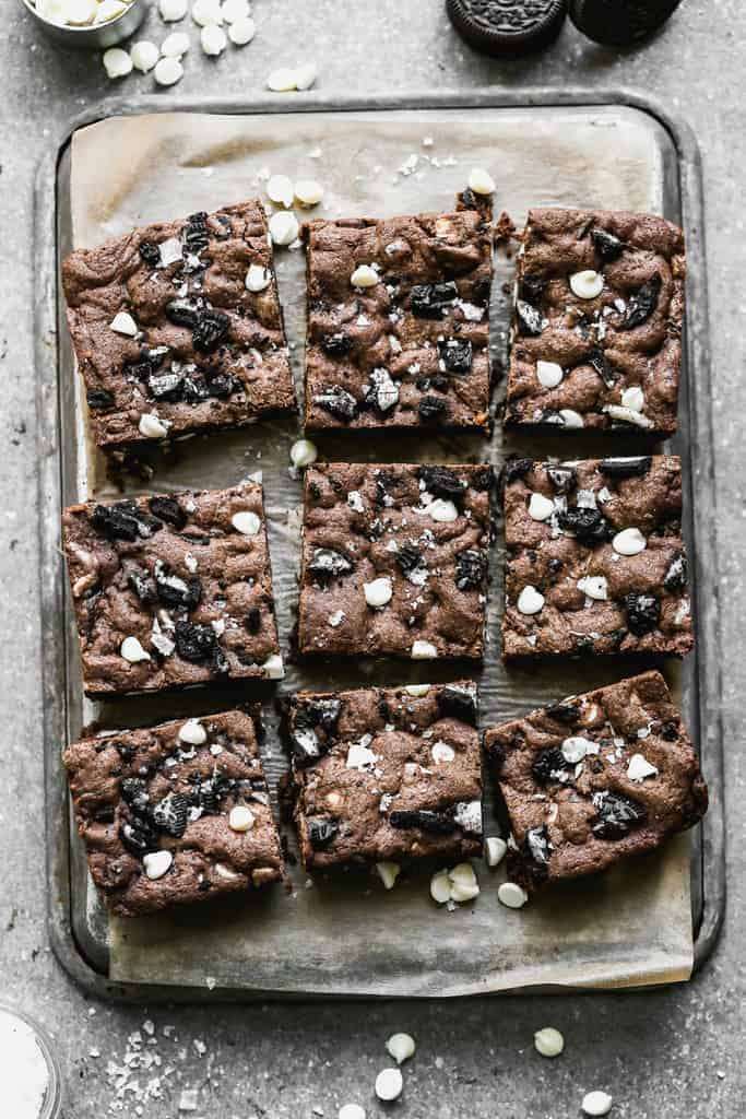 - Add dry ingredients and mix just until incorporated. Stir in Oreos and white chocolate chips. Press dough into pan.