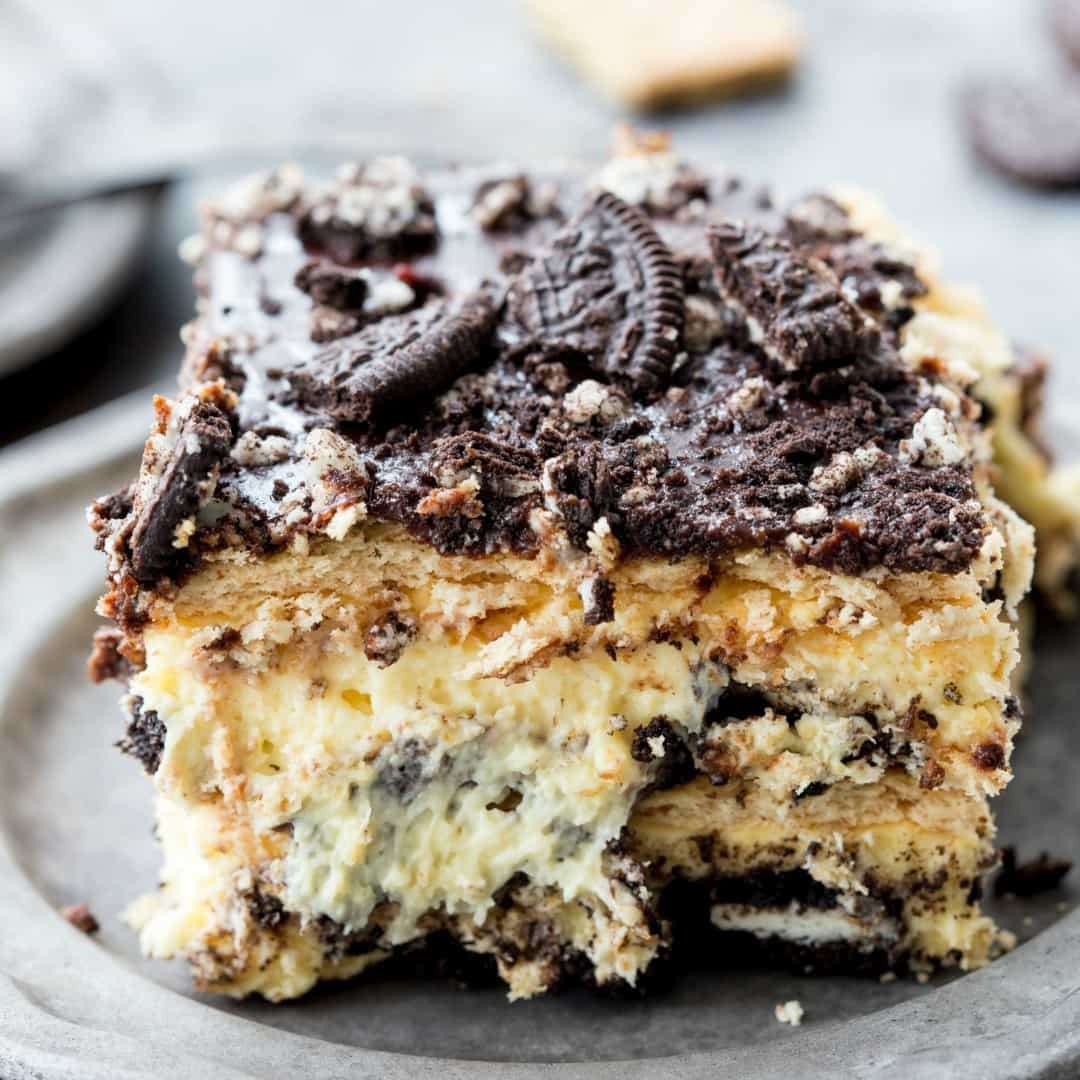 Oreo Cheesecake Icebox Cake is loaded with layers of graham crackers, no bake cheesecake, and OREOS for an easy, no-bake dessert you'll crave!