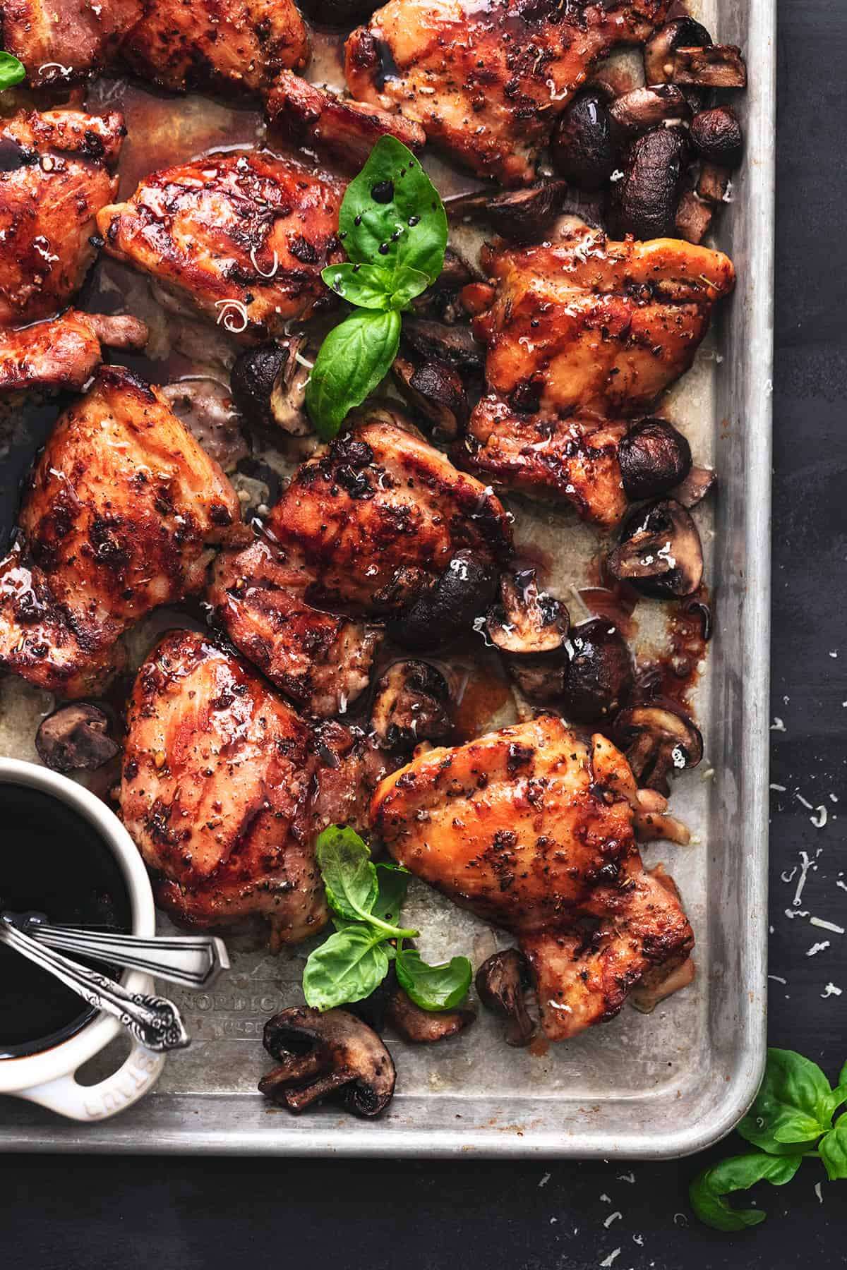 Tender and flavorful baked chicken thighs seasoned with garlic and herbs, browned in a skillet, and baked alongside savory mushrooms. Top it off with sweet and tangy balsamic glaze and some fresh basil for a simple chicken thigh dinner that will wow!