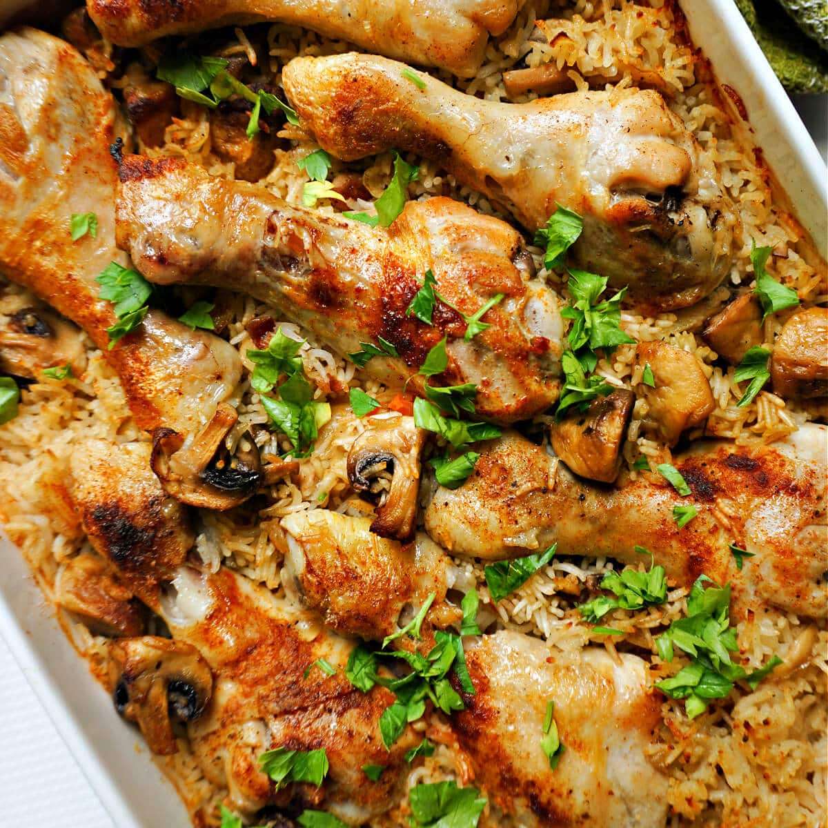 Oven Baked Chicken and Rice with Mushrooms, a complete dinner recipe to be enjoyed by the whole family. It's made with chicken drumsticks, basmati rice and closed-cup mushrooms, and cooked in chicken stock for a wonderful dish that screams perfection no matter the season.