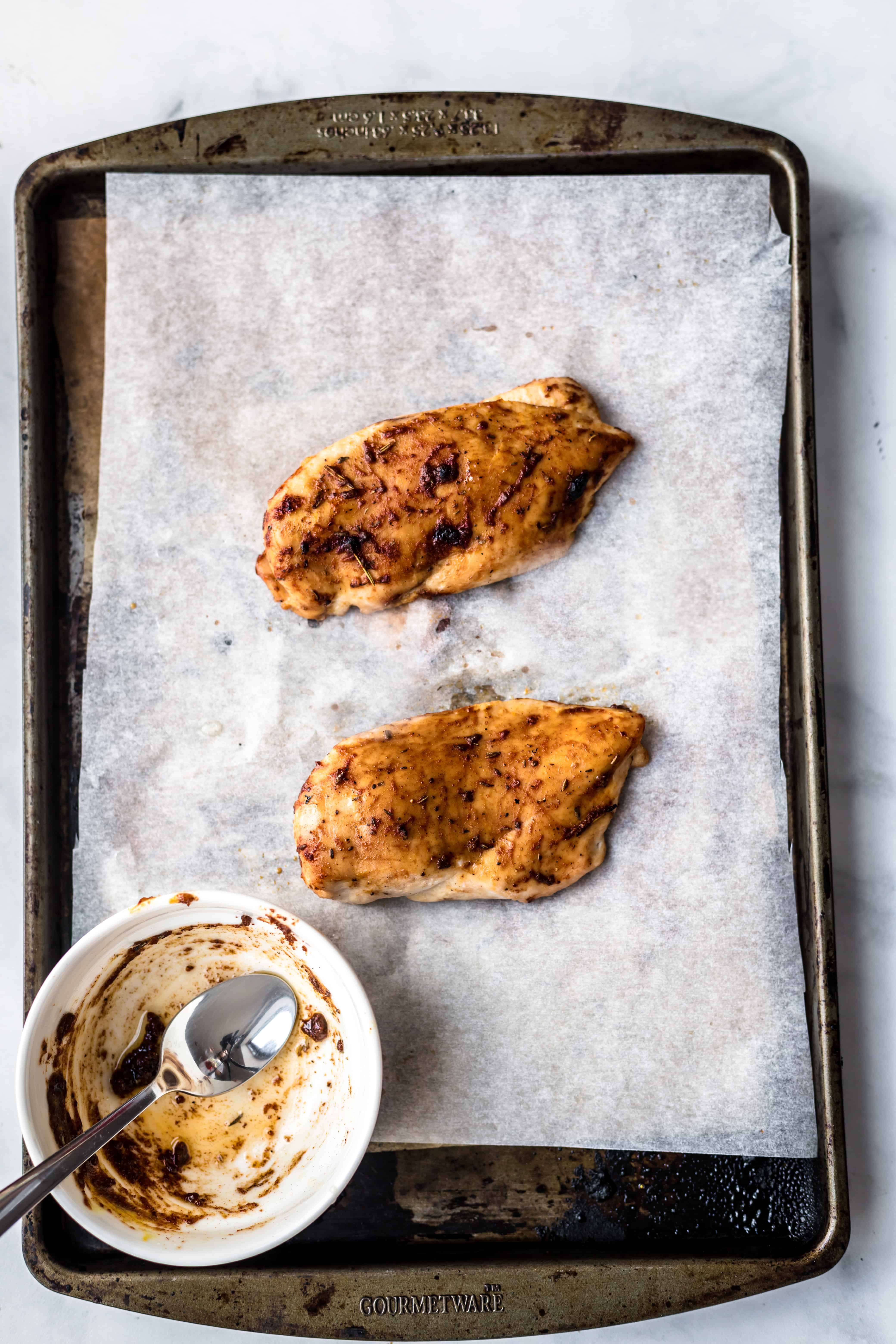 - Line a baking sheet with parchment paper, place chicken breasts on parchment paper, and spread the spice and oil paste evenly all over the chicken breasts, bottom and top.