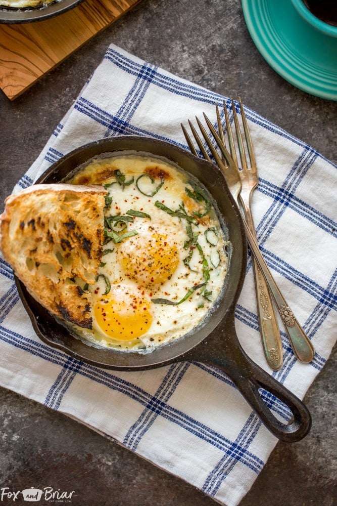 - When bubbly, remove from oven and add 2 eggs to each dish, top with 1-2 tablespoons of Parmesan cheese and basil. Place back in the oven under the broiler and cook until whites are set but yolks are runny (or to desired doneness). 2-4 minutes.