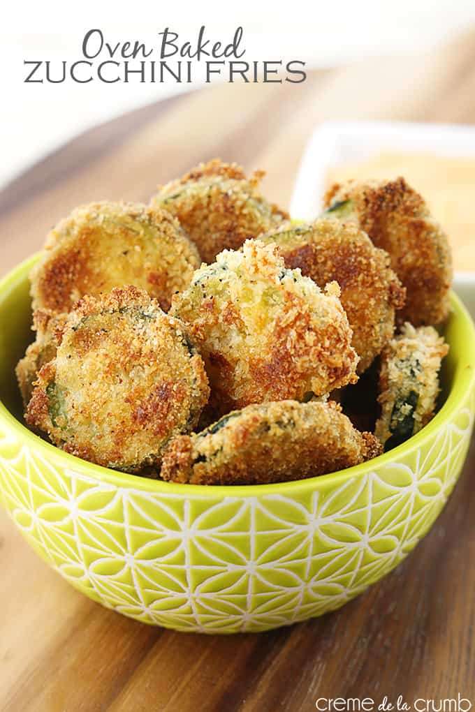 Crispy oven-baked zucchini fries with a spicy dipping sauce! A lightened up appetizer or side dish that will be on the table in less than 30 minutes!