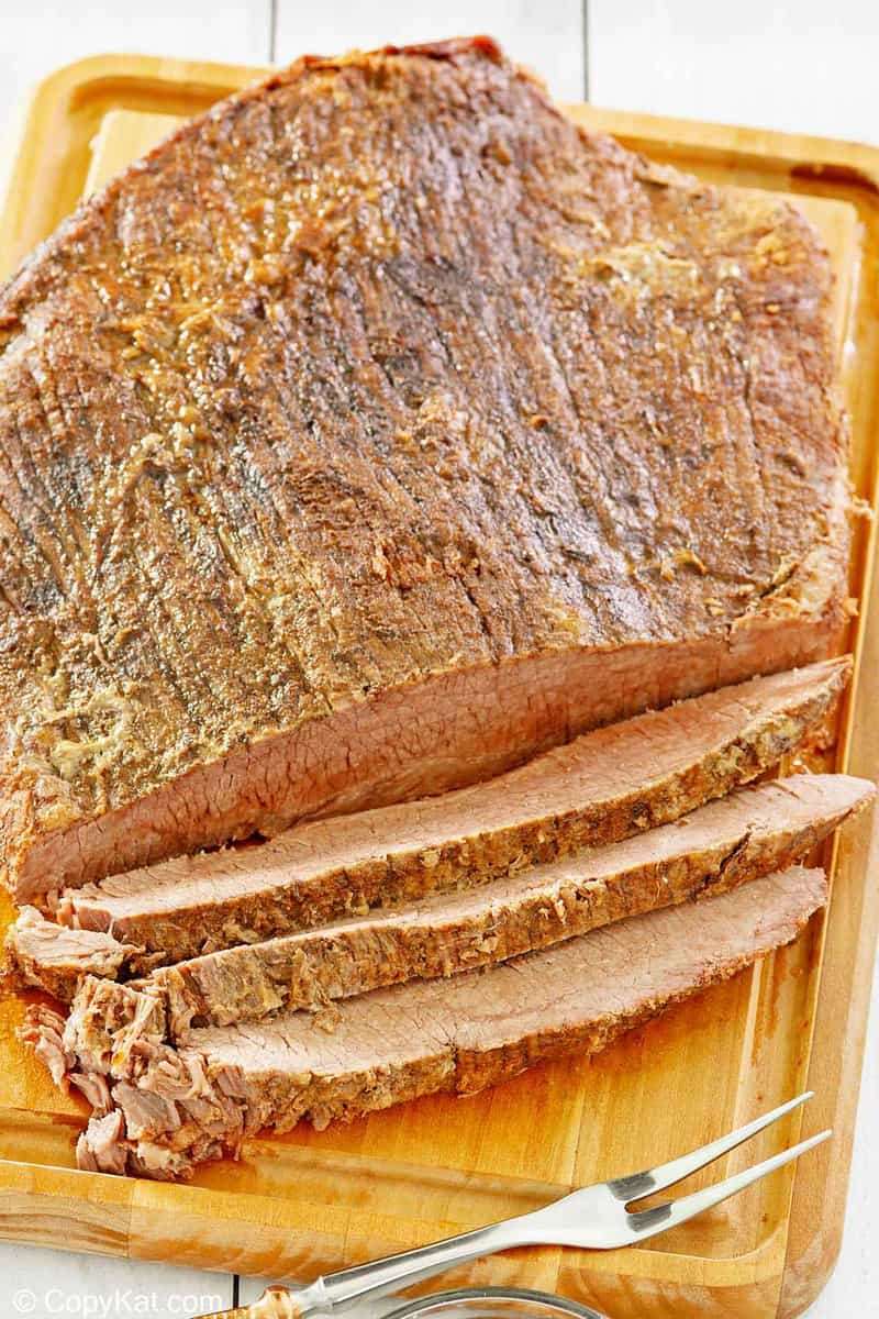 - Remove brisket from the oven, and allow to cook for about 25 minutes before slicing.