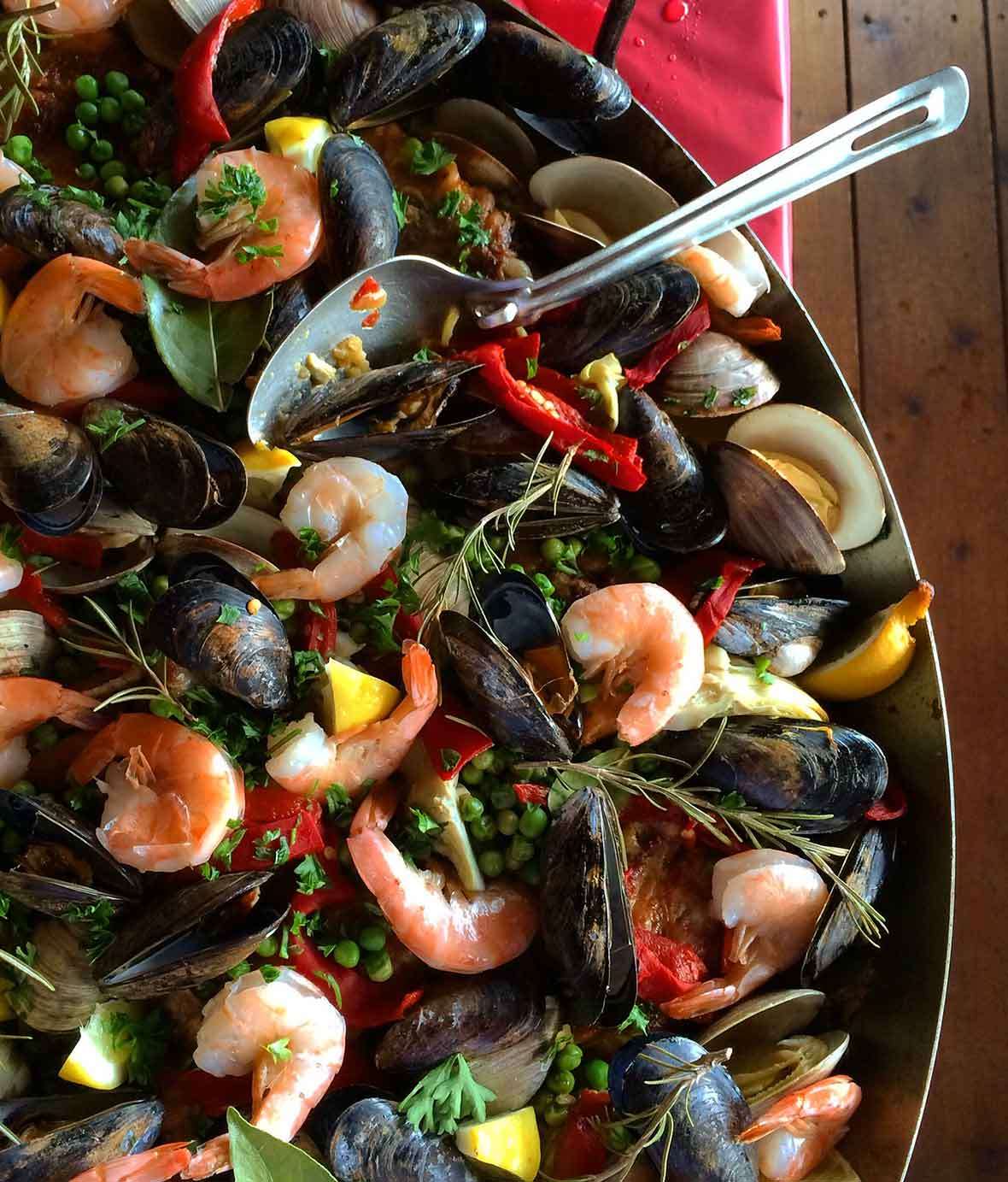 - Remove the paella from the oven (close the oven door to retain heat). Uncover the paella; scatter the shrimp over the rice, insert the mussels hinged-side down into the rice (so they stand upright), arrange the bell pepper strips in a pinwheel pattern, and scatter the peas over the top. Cover and return to the oven; cook until the shrimp are opaque and the mussels have opened, 10 to 12 minutes.