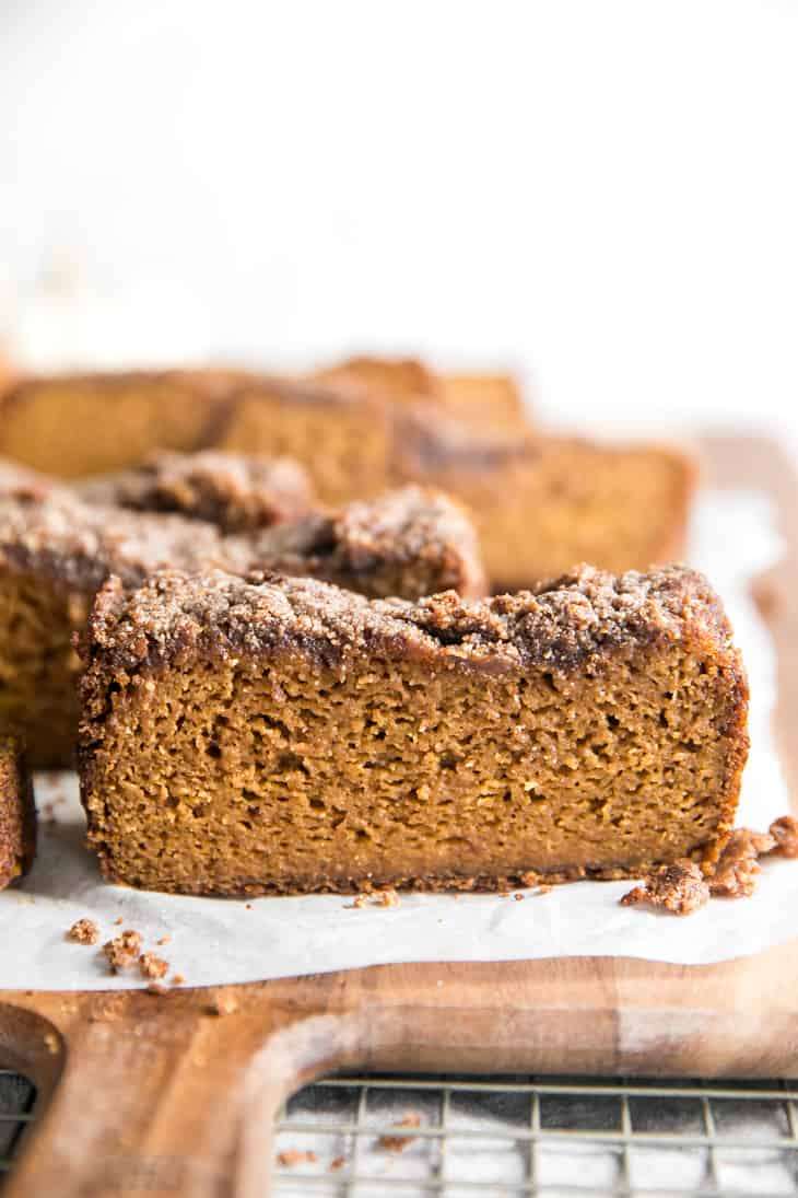 This Paleo Pumpkin Bread is made with almond flour, lightly sweetened, and topped with a cinnamon crumble. Simple recipe with nutrient-dense ingredients for a healthy treat.