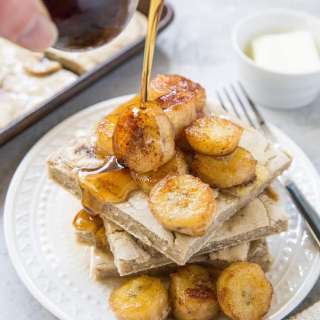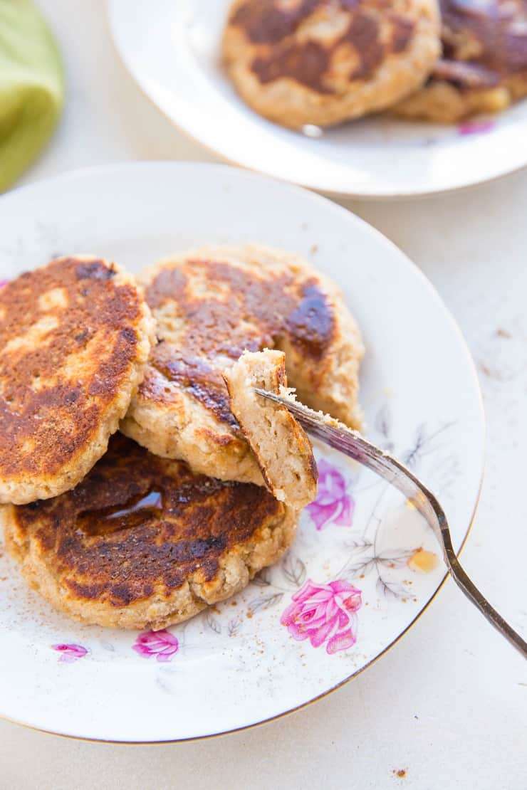 Grain-free vegan banana pancakes that are moist, dense, fluffy and crispy.
