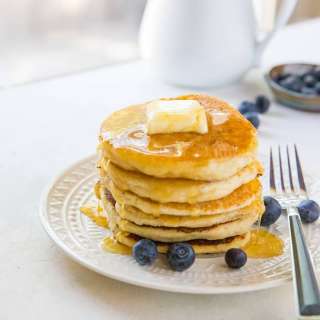 - Serve pancakes with choice of pure maple syrup, almond butter, fresh fruit, raspberry chia seed jam, etc.