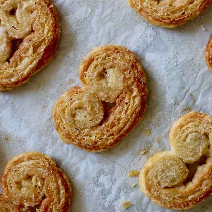 - Never bake the palmiers on a smooth silicone sheet (not airy), the puff pastry will slip on it during baking and will not keep their heart shape. It is recommend to use baking paper or a ventilated silicone mat, such as Silpat, which holds the dough.